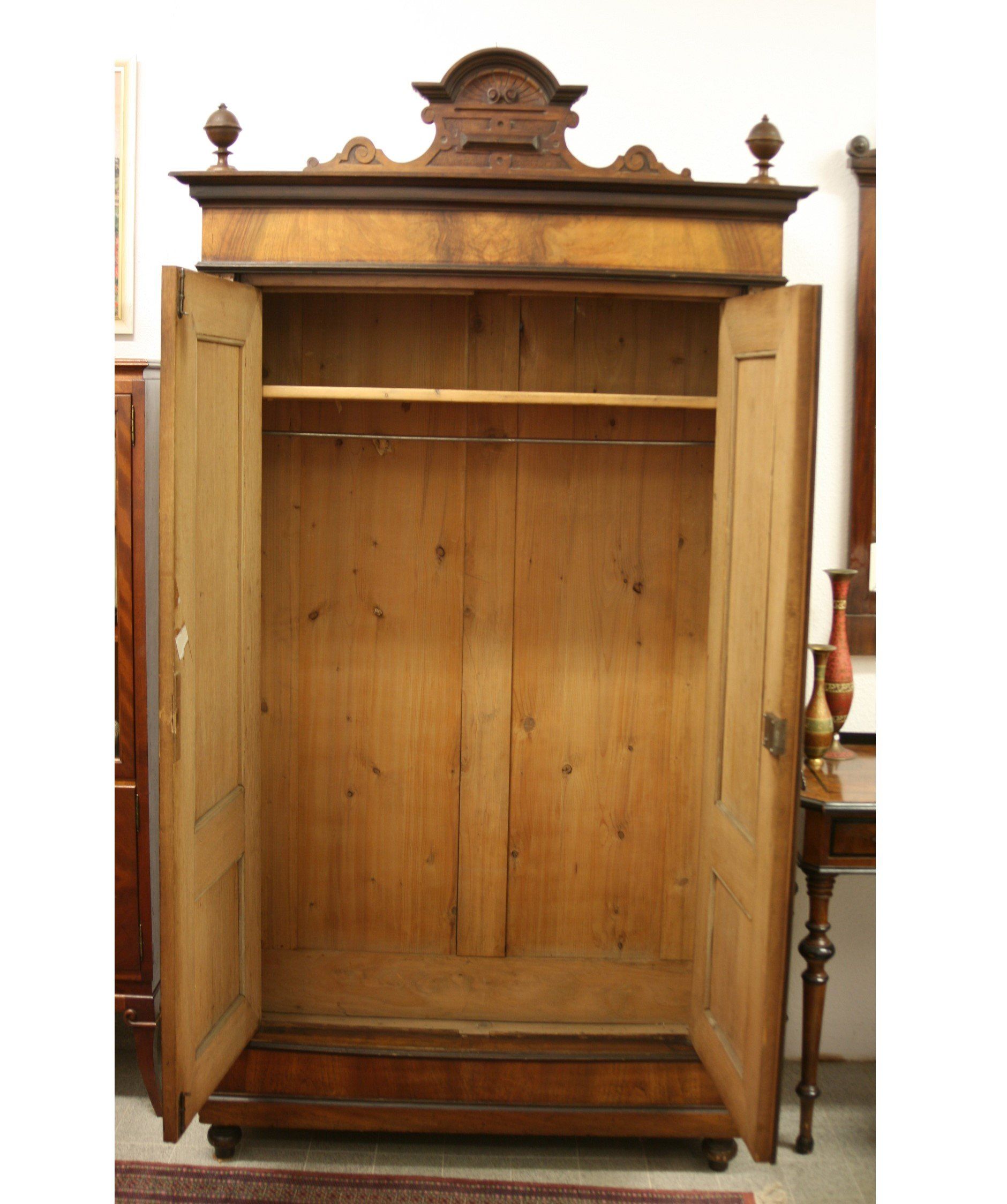 Aus Weichholz gefertigt und aufwendig mit Nußbaum furniert ist der Schrank schön proportioniert.