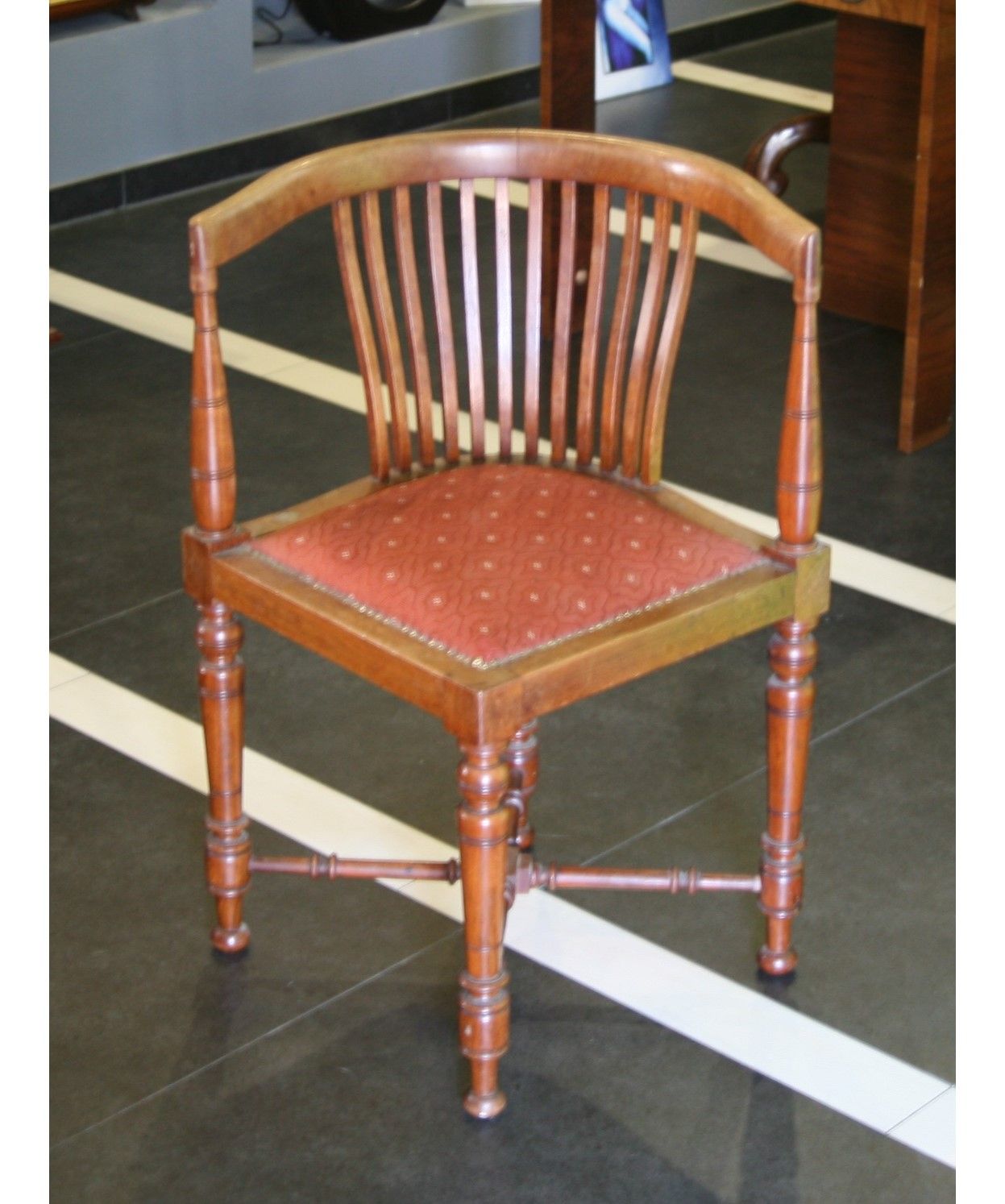 Statt wie üblicherweise der je zwei Beine vorne und hinten, befindet sich bei diesem typischen Schreibtischarmlehnstuhl ein Bein vorne mittig, das konträre Bein rückseitig und jeweils ein Bein seitlich.