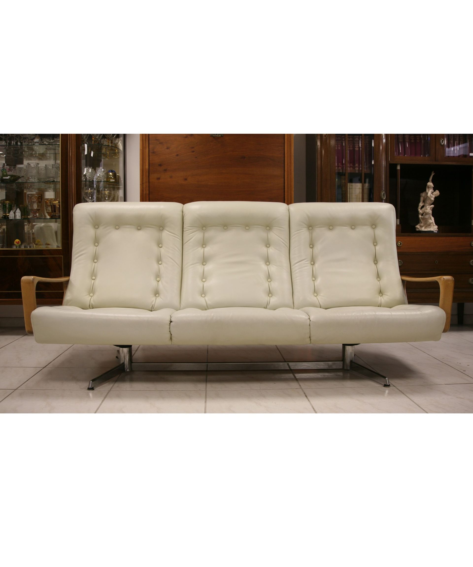 Ein seltenes und bequemes Sofa aus Erstbesitz aus den 60er Jahren. Das Design erinnert an André Vandenbeuck. Das Sofa schwebt förmlich auf dem verchromten Gestell mit Gleitkufen. Die leicht geschwungenen Armlehnen mit der haptisch schönen Oberfläche, ohne störende Kanten, runden das Gesamtbild ab.