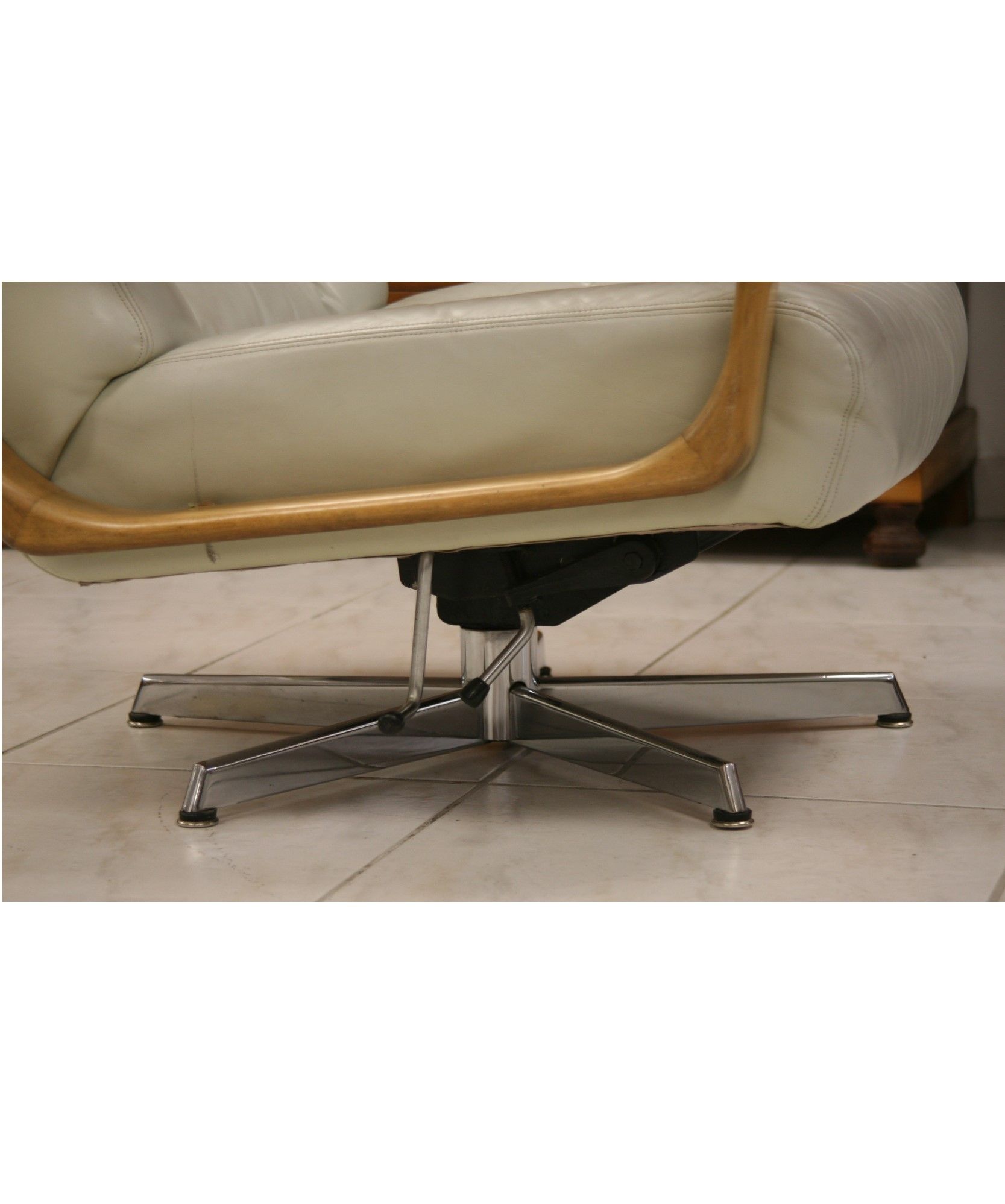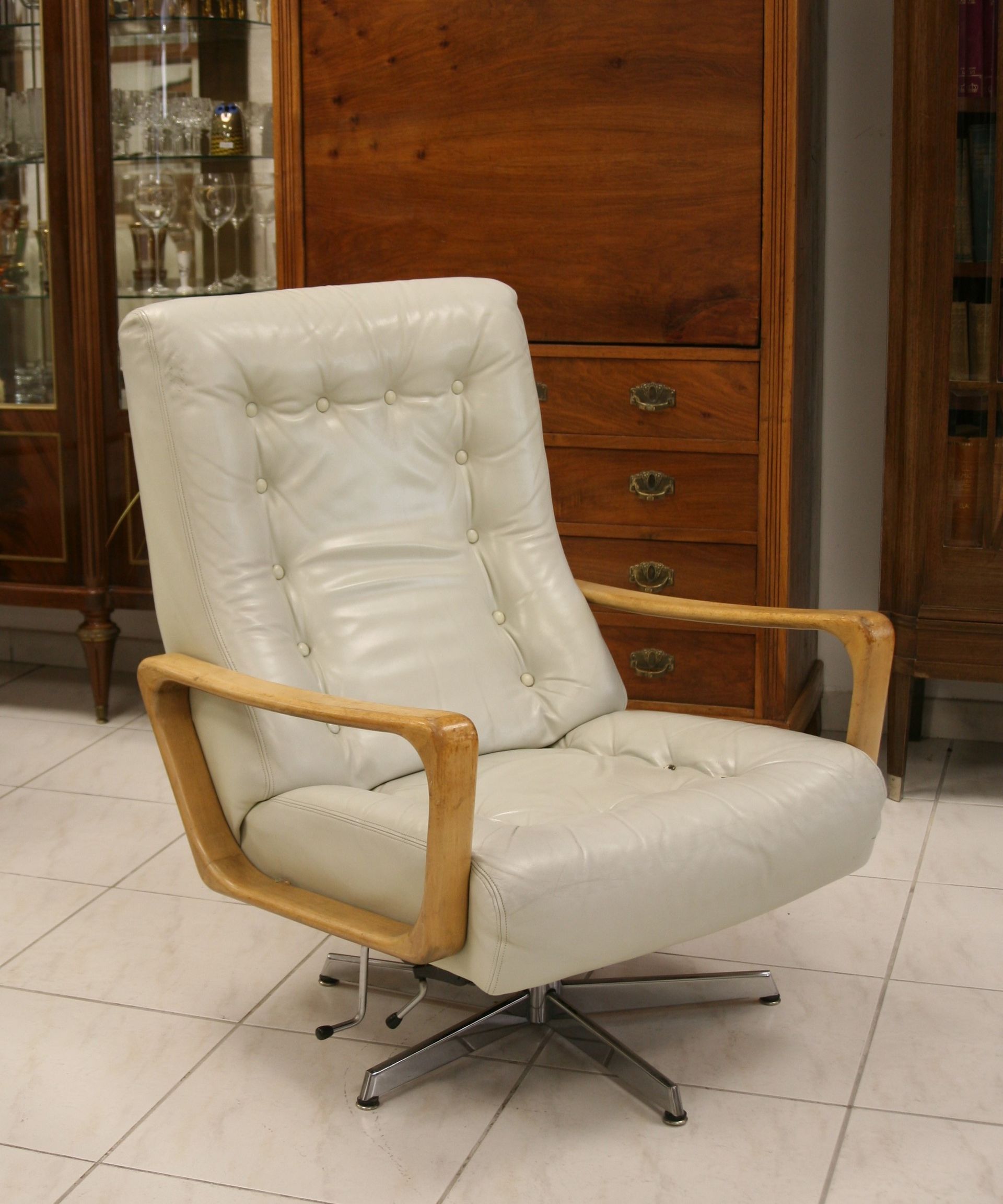 Die Polsterung ist sehr gut erhalten, straff und nicht durchgesessen. Das Leder, die Knöpfe und Armlehnen weisen eine alterstypische und durch den Gebrauch entstandenen Patina auf. Wie üblich wurde ein Sessel weniger genutzt. Ein insgesamt sehr schöner, ehrlicher und authentischer Vintage -Zustand.