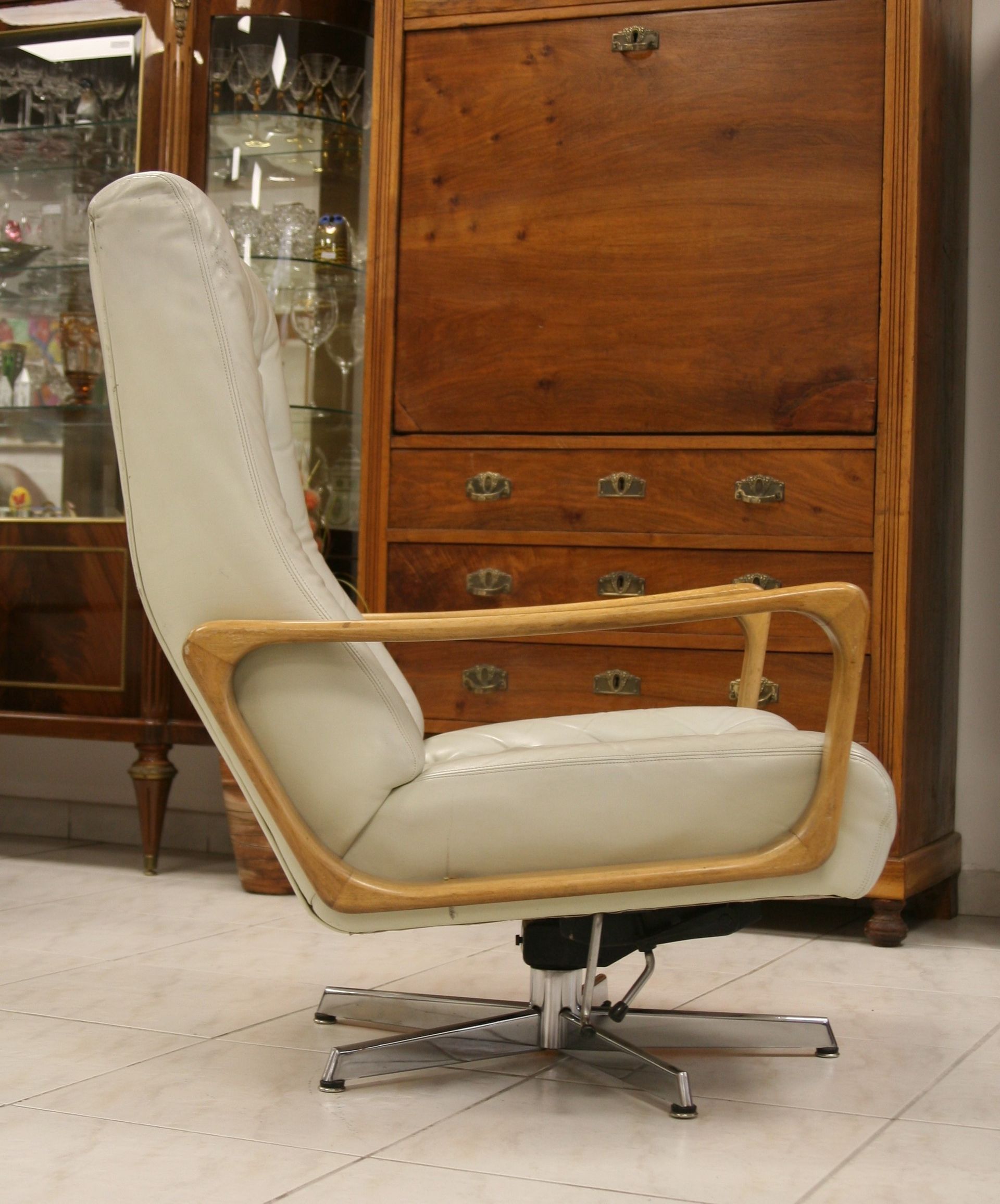 Statt wie üblicherweise der je zwei Beine vorne und hinten, befindet sich bei diesem typischen Schreibtischarmlehnstuhl ein Bein vorne mittig, das konträre Bein rückseitig und jeweils ein Bein seitlich.