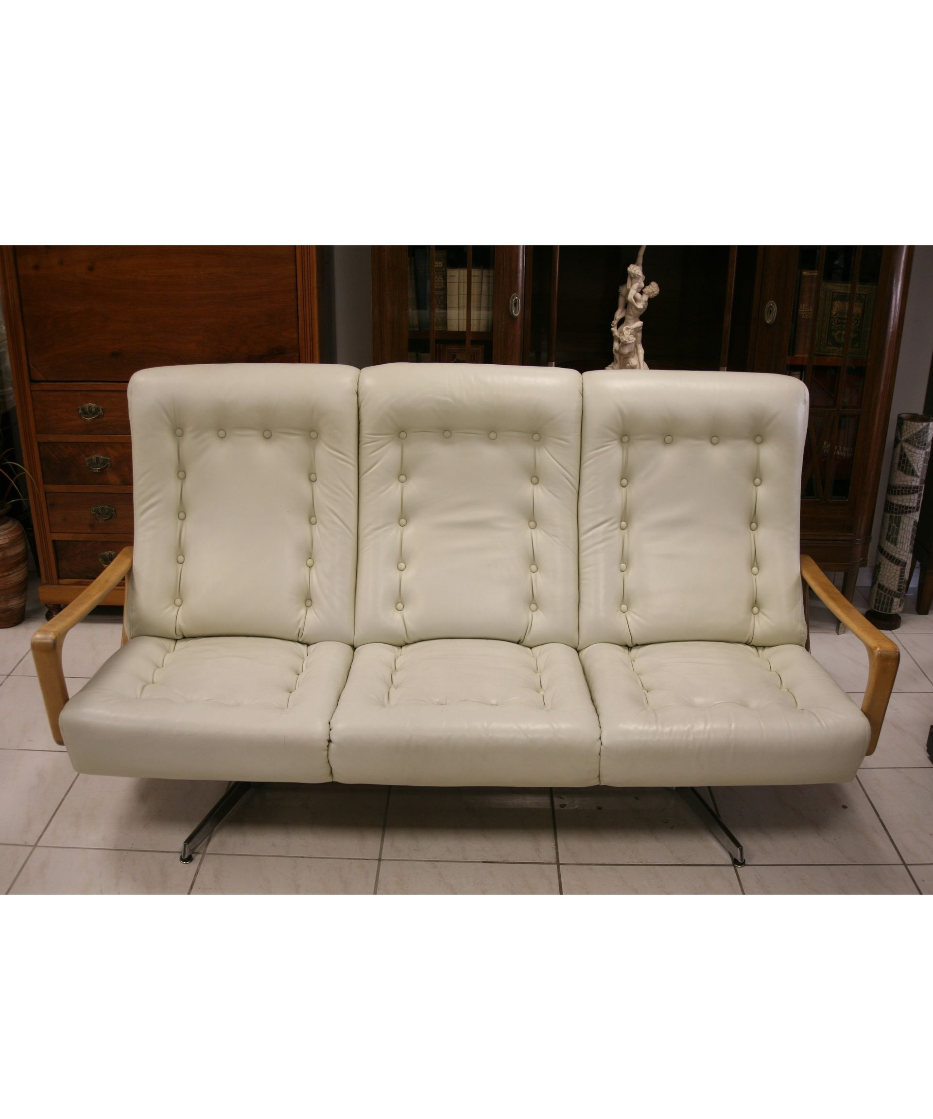 Die Polsterung ist sehr gut erhalten, straff und nicht durchgesessen. Das Leder, die Knöpfe und Armlehnen weisen eine alterstypische und durch den Gebrauch entstandenen Patina auf. Ein insgesamt sehr schöner, ehrlicher und authentischer Zustand.