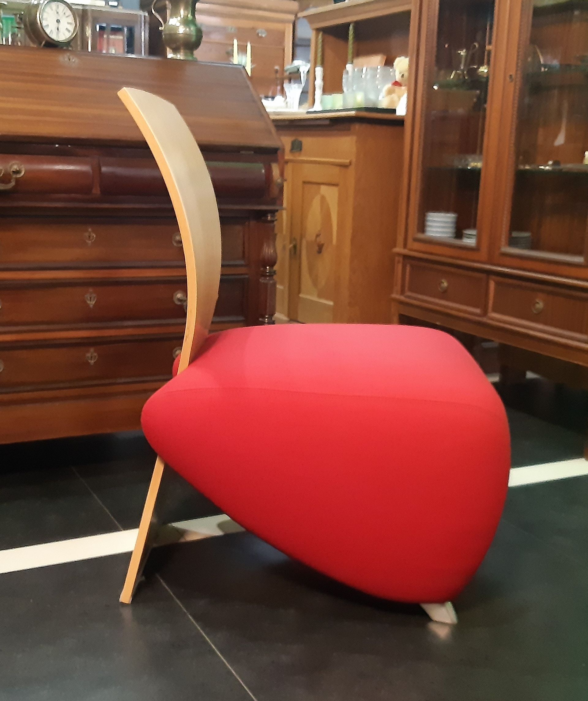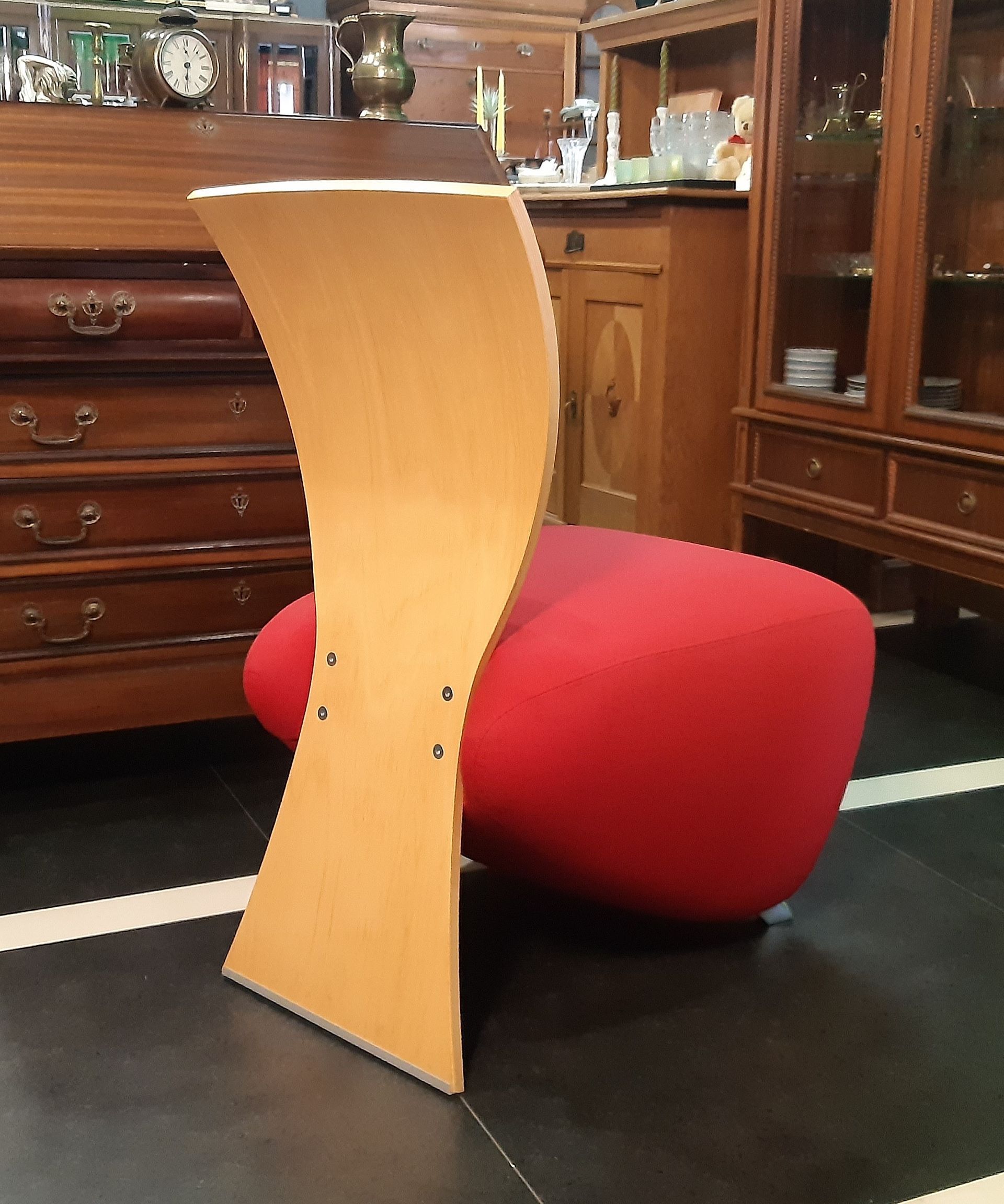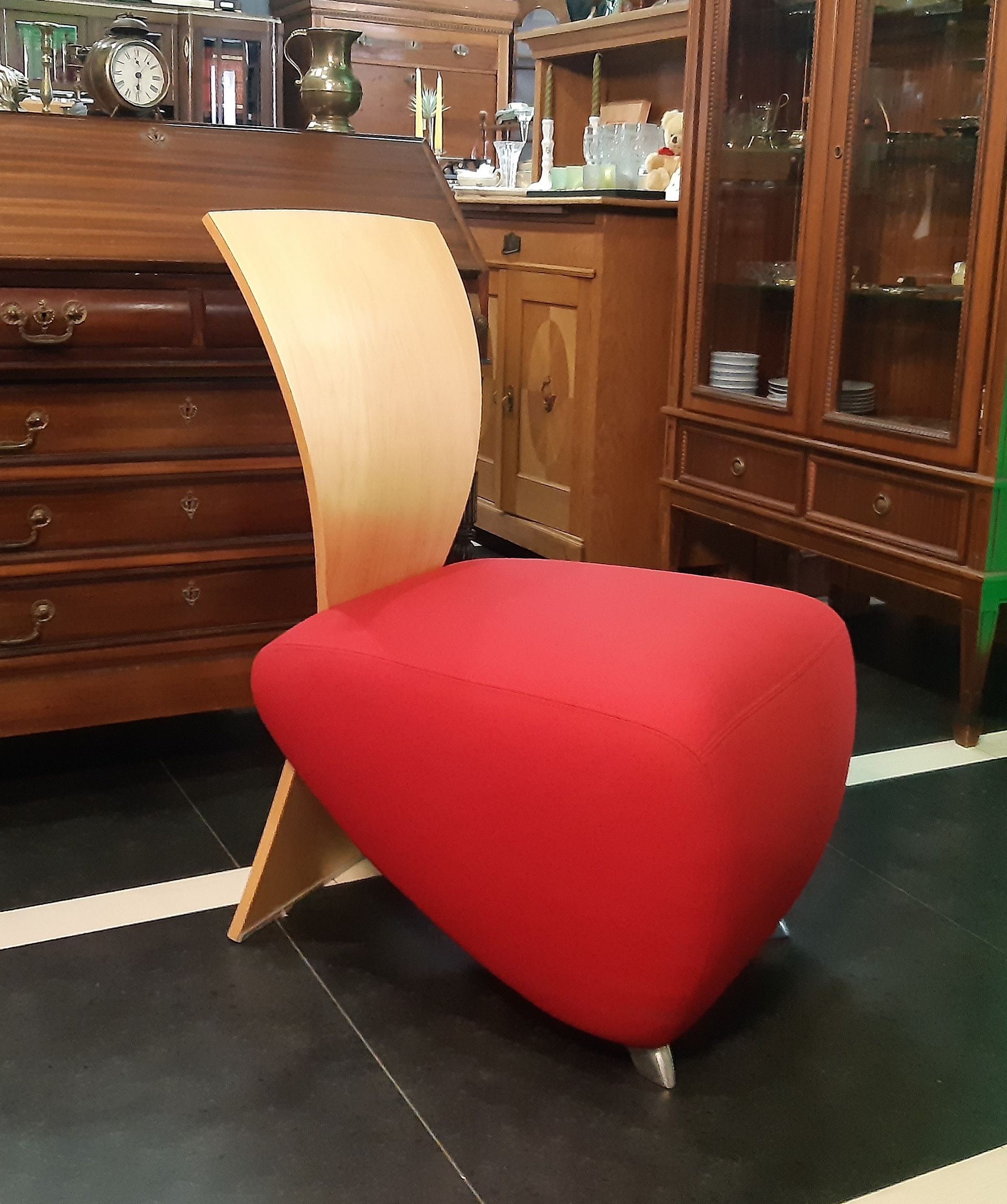 Der angebotene und markante Sessel ist ausgestattet mit einem Sitzbezug aus rotem Stoff, polierten Beinen sowie einer Rückenlehne aus hellem Schichtholz .