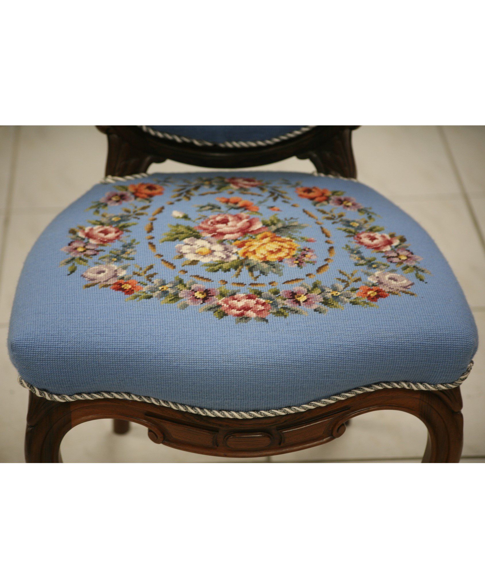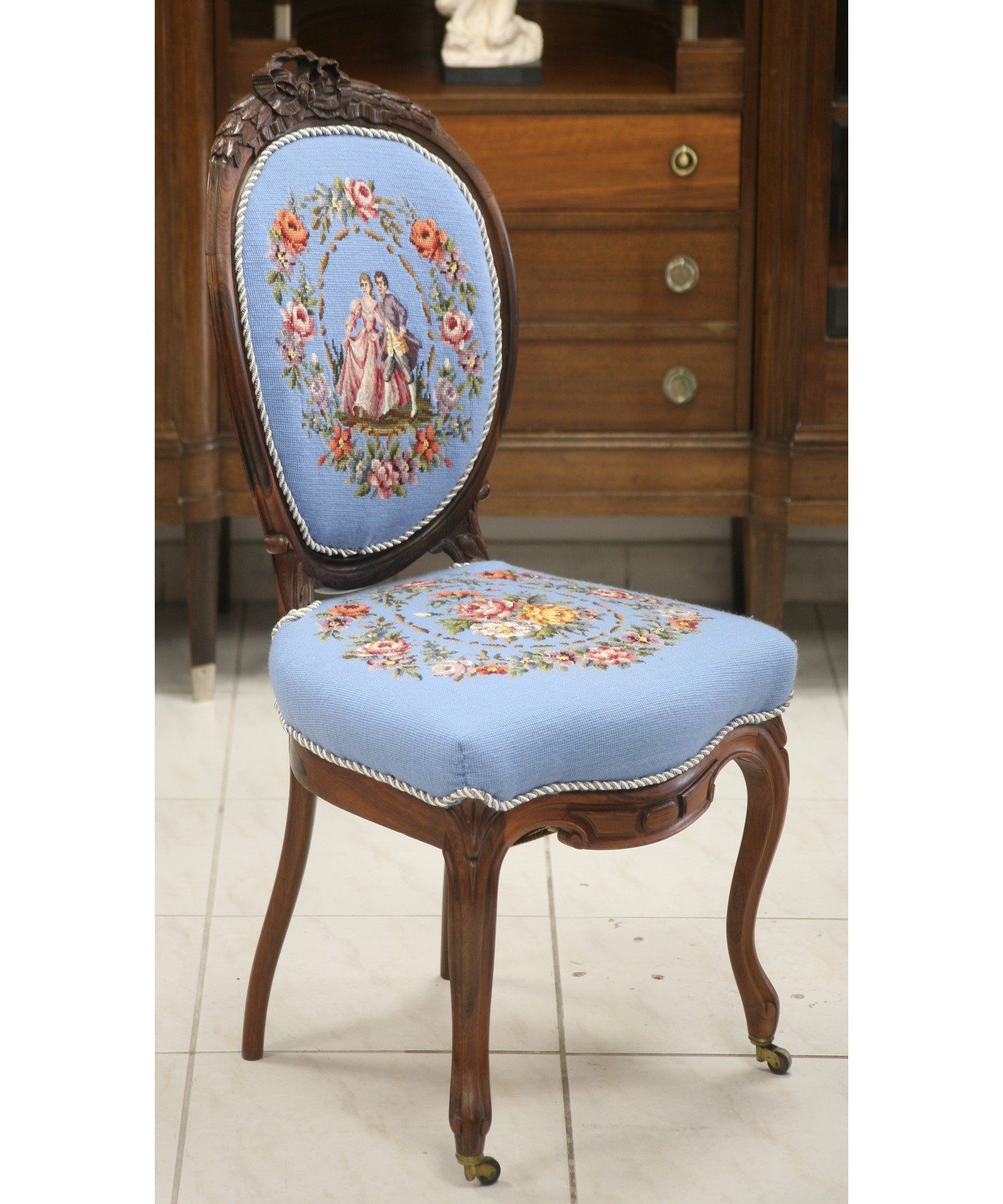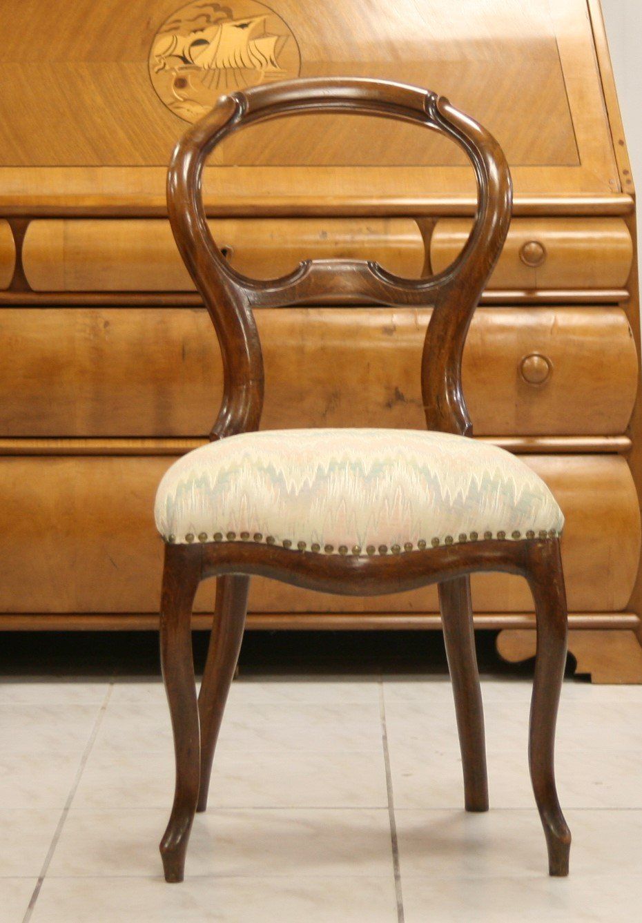 Ein sehr schöner und restaurierter antiker Polsterstuhl im Stil des Louis Philippe. Die Lehnen und Sitze sind mit stiltypischem Stoff neu bezogen und gepolstert worden.