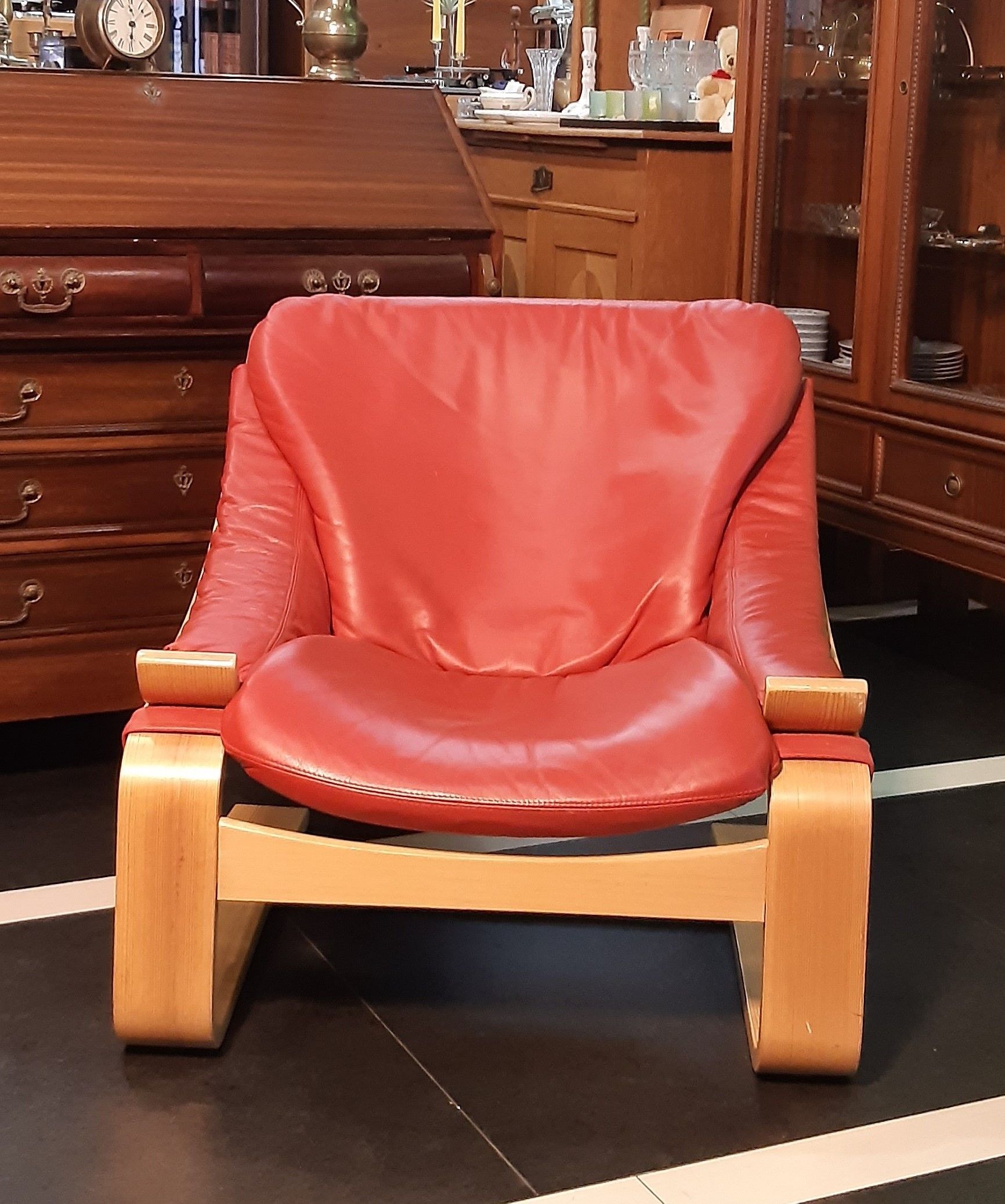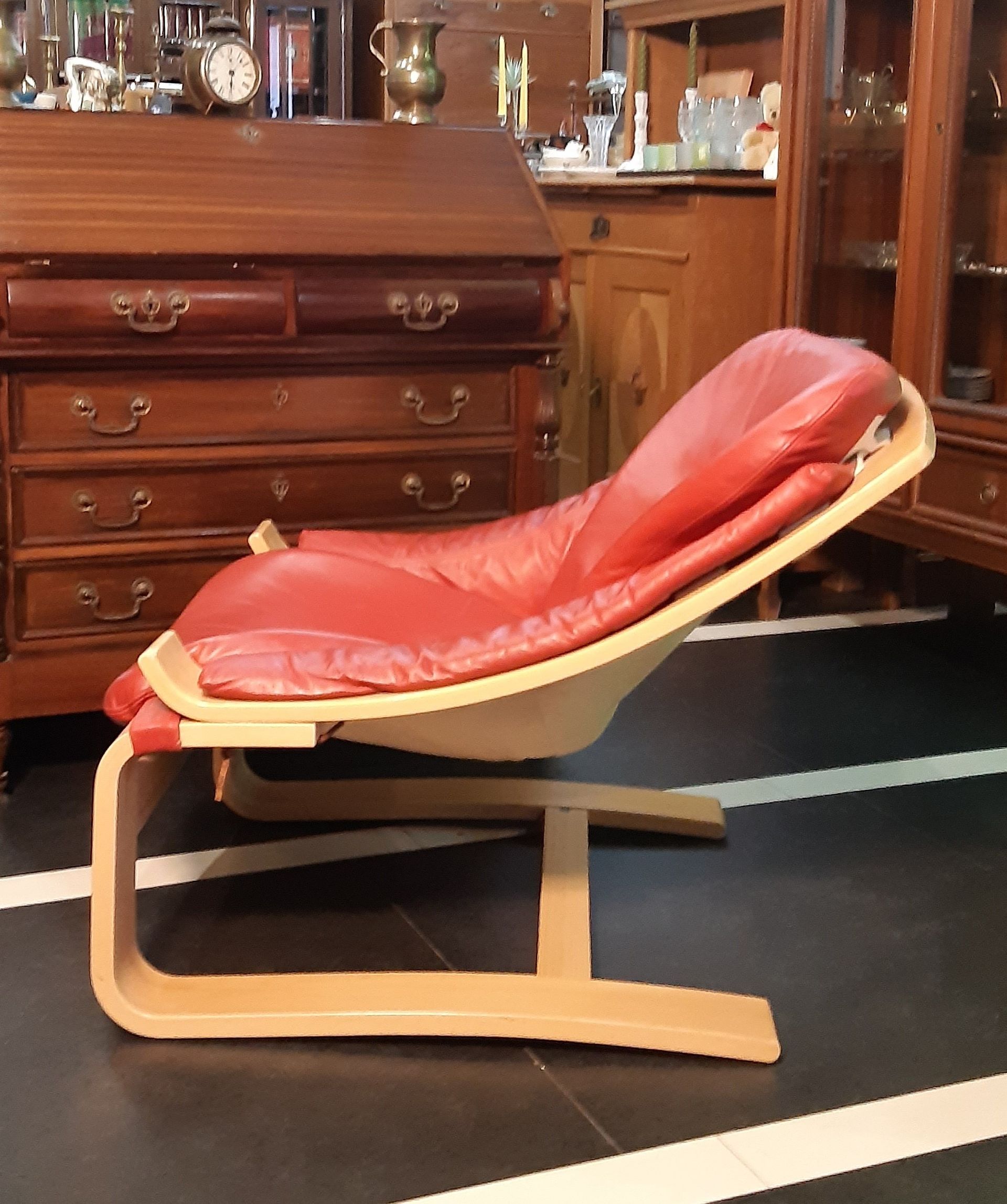 Ausgestattet mit rotem Leder und hellem Gestell aus Bugholz, befindet sich der Sessel in einem sehr guten Zustand, ist für sich genommen schon eine Augenweide und eine Bereicherung für nahezu jedes Wohnumfeld.