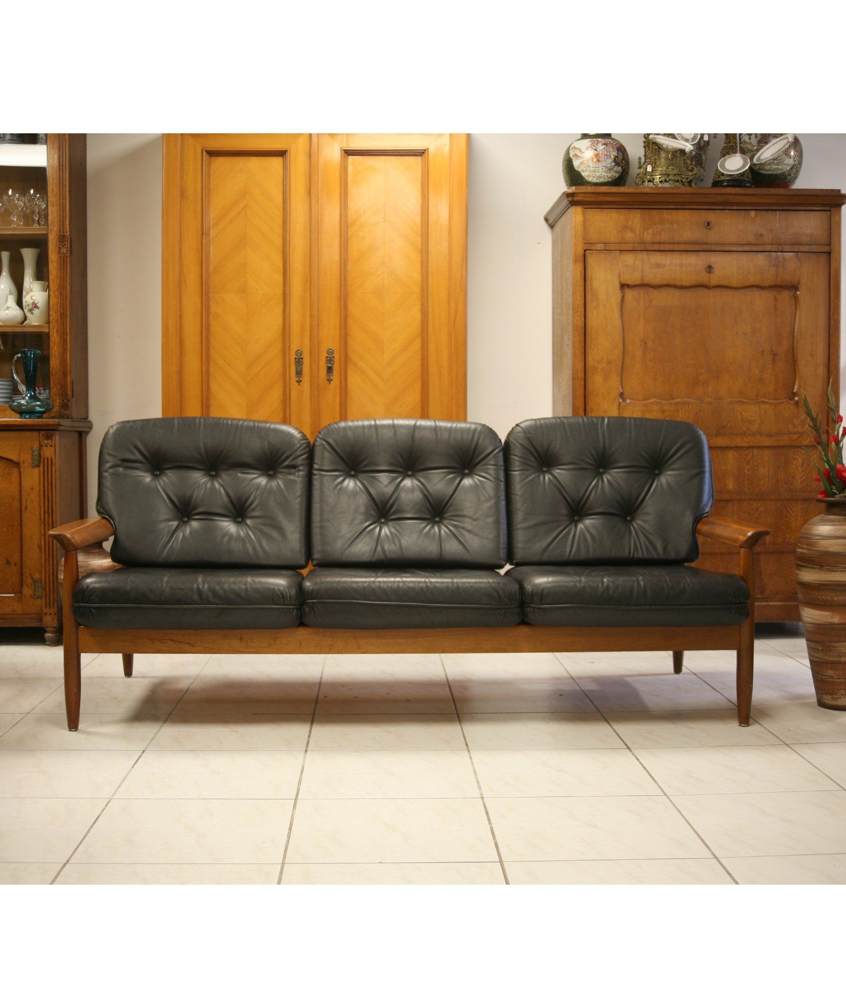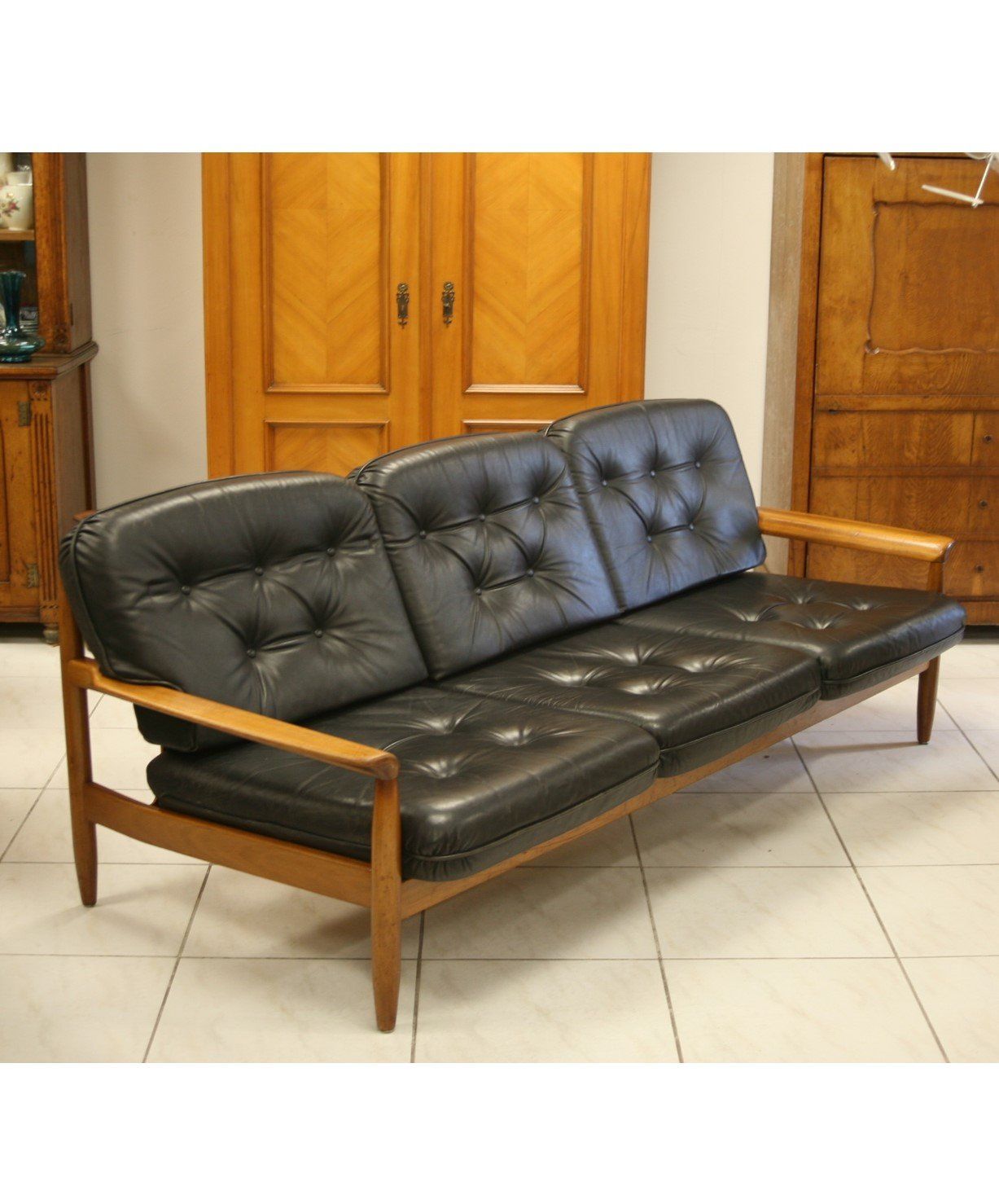 Das Sofa mit seinem schönen Gestell in der Ausführung Teak mit schwarzen Lederpolstern, kann durch die wunderschöne Gestaltung der Rückseite als Blickfang frei im Raum platziert werden und erhält seine Leichtigkeit u.a. durch den leichten Schwung der seitlichen Elemente als auch durch die abgerundete Oberfläche.